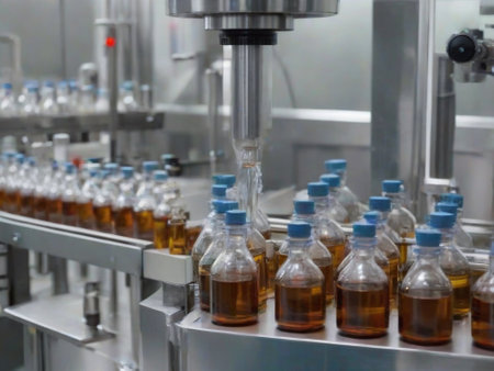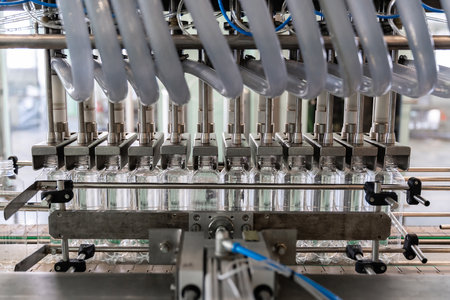 Bottling plant - Water, oil, medicines bottling line for processing and bottling into bottles. Selective focus. Ai generative