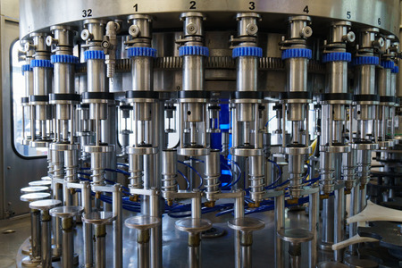 Production line for filling bottles with water. Closeup.