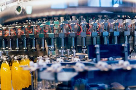 Bottling line of orange juice in bottles on a modern beverage factory. Industrial background