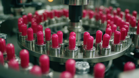 Captivating close-up of a lipstick production line showcasing vibrant containers in a circular layout, highlighting the intricate machinery of the cosmetic manufacturing process.