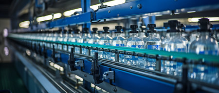 Industrial beverage factory interior with automated computerized conveyor line or belt and plastic bottles with organic juice.