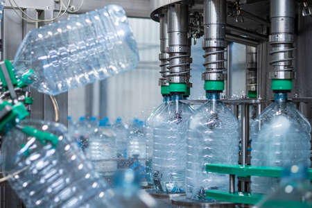 Five-liter plastic bottles are filled with water in a filling machine. Automated production of drinking water. Food production