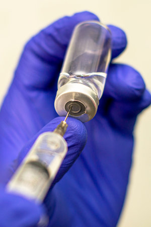 a hand in a blue medical surgical glove picks up a vaccine from an ampoule with a syringe