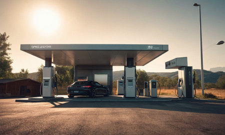 Busy gas station at dusk: customers, pumps, colorful sky. Hustle and bustle and convenience., generative AI