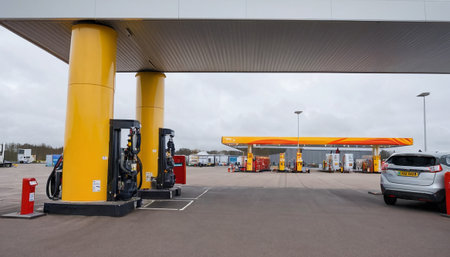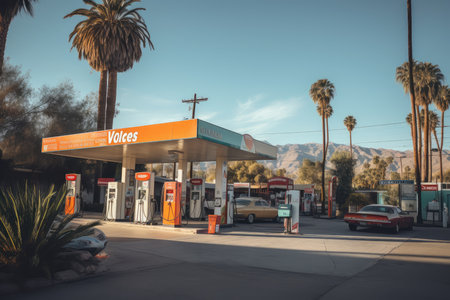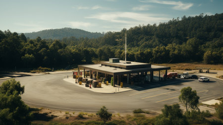 Vivid daytime photograph of a bustling gas station surrounded by clear skies and lively scenery