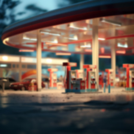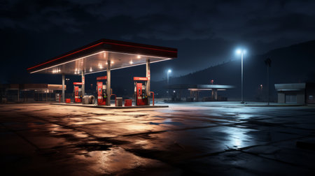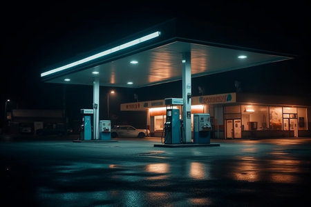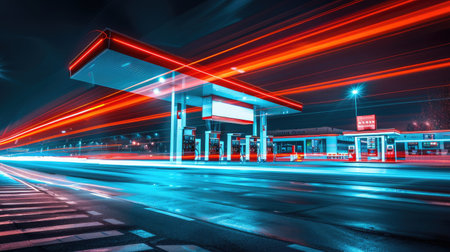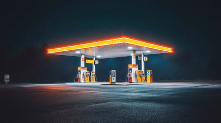 Vibrant gas station glows with bright pump nozzles as the sky transforms into a beautiful sunset with hues of red and orange in the background.