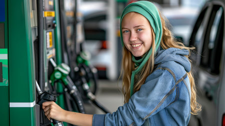 Closeup of a woman's hand holding a green gasoline pump, refueling her car at a self-service gas station with a modern backdrop.
