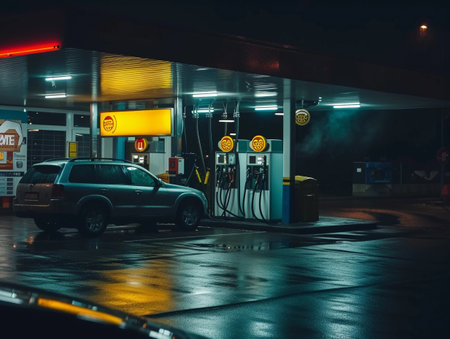 A Refueling car at gas station with fuel tank door open, showcasing fuel pump and nighttime ambiance. scene captures convenience of refueling