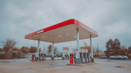 This image features a modern gas station with a bright red canopy, empty parking area, and fuel pumps, surrounded by trees and buildings under a cloudy sky.