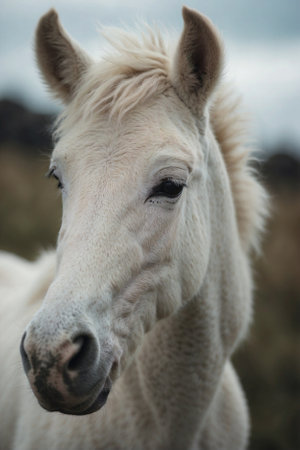 Cute white foil in close-up. Portrait of a soft and fluffy foal