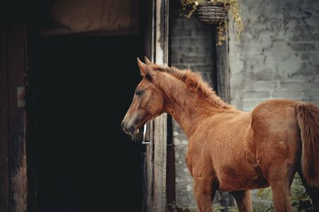 Portrait of a red foal against the entrance to the stable. Small horse.