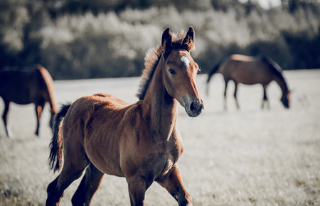 Curious foal grazing in the field in the herd. A herd of red sports horses. horses grazing in the field. Rural landscape.