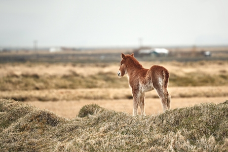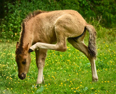 A newborn small dun colored foal of an icelandic horse scratches itself with a leg behind the ear like yoga or gymnastics
