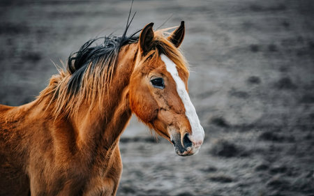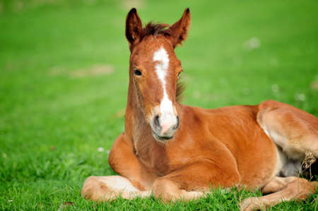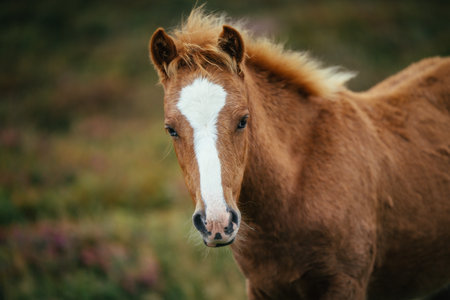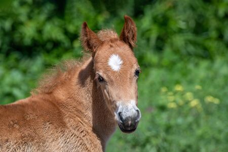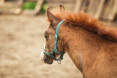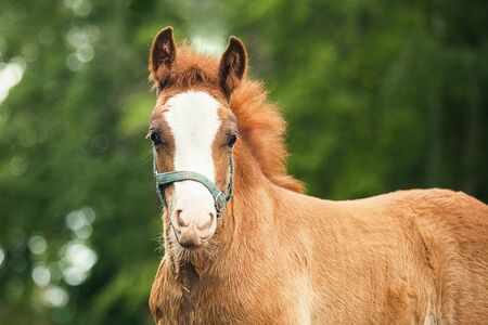Portrait of a red foal sporting breed with an asterisk on his forehead. Small horse.