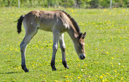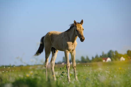 The picture shows a small foal,a field,grass,sky.Foal grazing in the meadow.