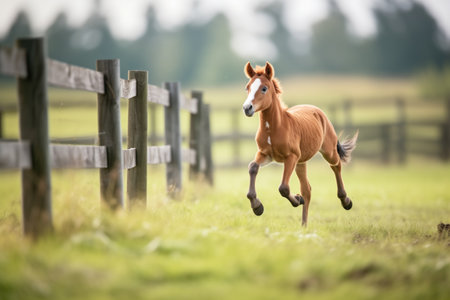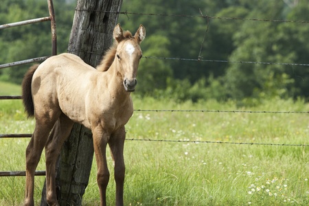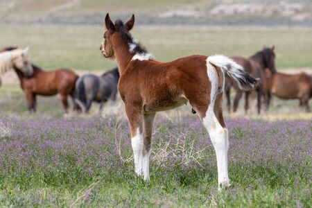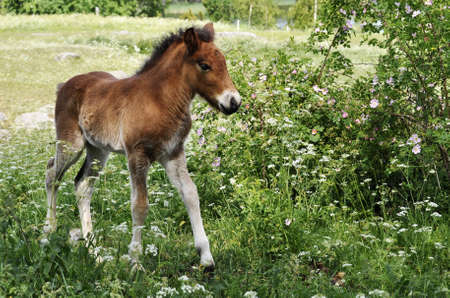 A pretty foal stands in a Summer paddock, Foal playing in a meadow