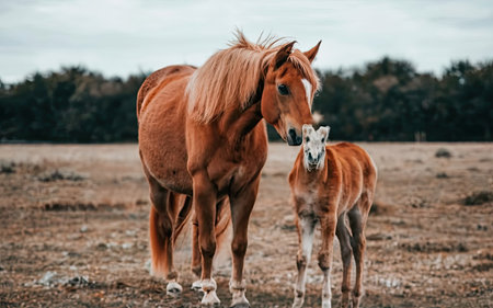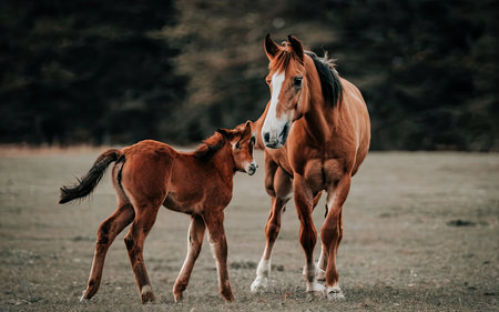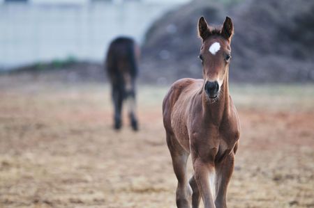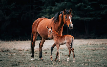A cute shy foal of a bay suit with a white spot on his forehead stands near his mother