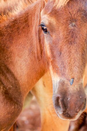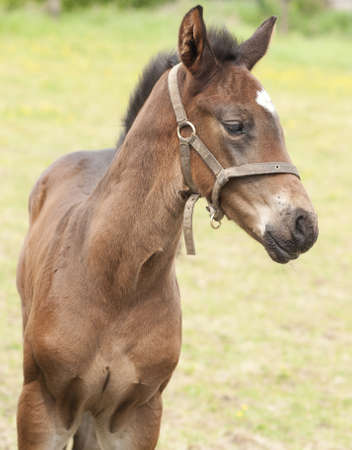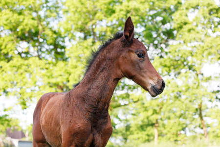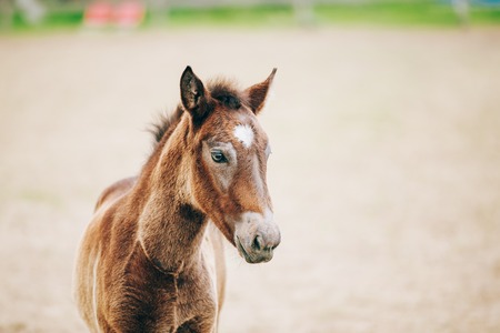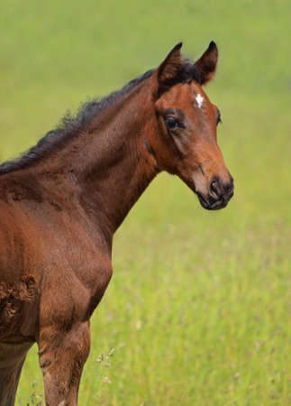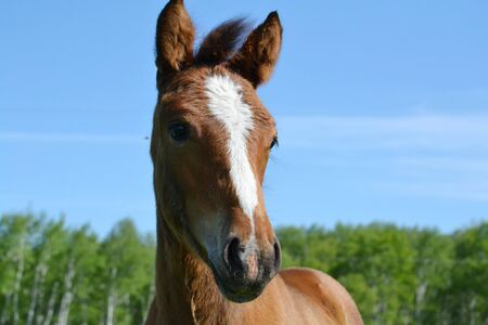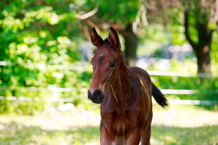 Portrait of a bay foal with a stripe in the paddock on a sunny day
