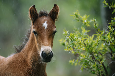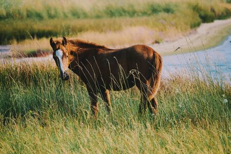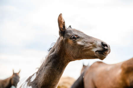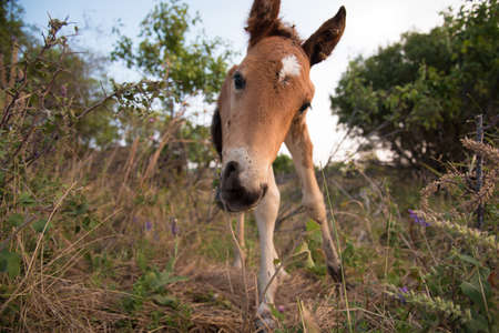 The little foal looks directly into the camera. A curious animal examines the photographer. Foal among grass and nature. Portrait
