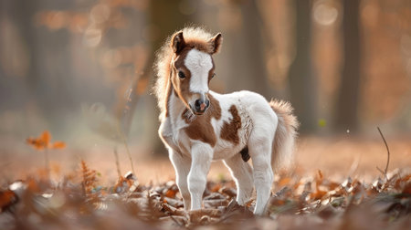 Cute shetland foal walking through the meadow, exploring the world. Magic forest