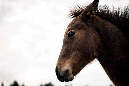 Close Up Portrait Of Brown Foal Young Horse. Toned Instant Photo