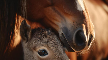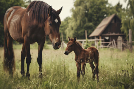 A mother horse affectionately nuzzles her foal in a green pasture, surrounded by tall grass and trees, with a rustic barn in the background on a bright day.