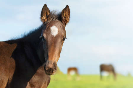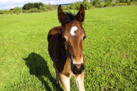 The foal head is a close-up. Portrait of a thoroughbred colt grazing in a meadow. Pasture on a sunny summer day. Summer background
