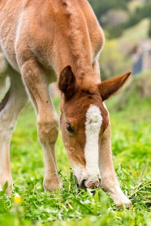 A young thoroughbred brown foal walks and plays on a green pasture. Little stallion frolic and eat grass on a spring meadow, on a bright sunny day.