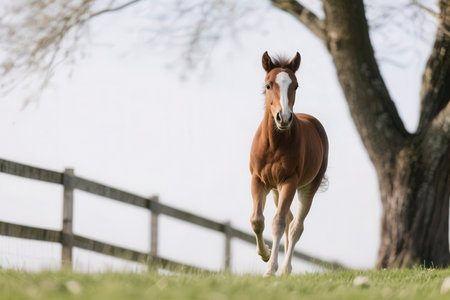 Portrait of English thoroughbred foal at sunset looking at the camera. Light background with copy space.