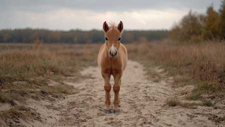 The foal gazes curiously at the viewer, its mane flowing in the wind against a backdrop of dark, moody clouds. This moment showcases the youthful spirit and beauty of the animal.