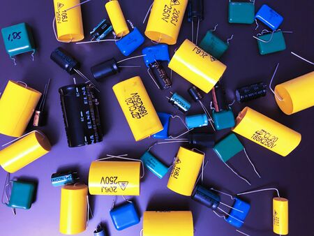 Heap of various ceramic disc and rectangular fixed capacitors and film capacitors with axial and radial connecting leads, fragment close-up in selective focus