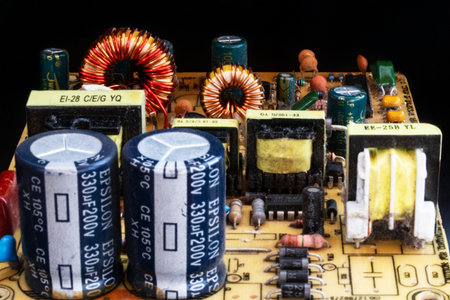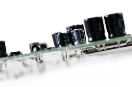 Closeup of electronic circuit board with capacitor yellow, macro capacitor