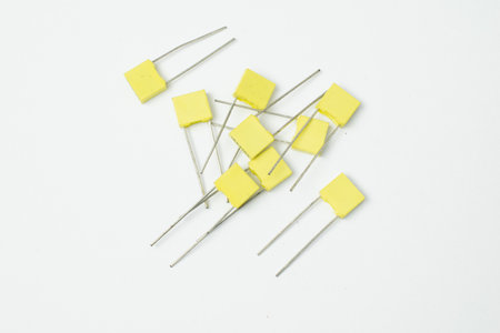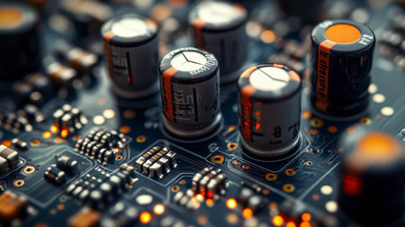 Detailed close-up image of vibrant capacitors on a circuit board, perfect for showcasing electronic engineering and the intricacies of modern technology and design.