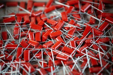 Close-up of a bunch of red capacitors lies on top of each other at an office equipment and computer factory. Concept of quality parts. Wholesale batch of capacitors