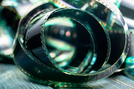 Spiral retro film strip in soft green light. Twisted analog old strips of film for a photo or video camera close up. The concept of cinematography, photography, photographic memories.