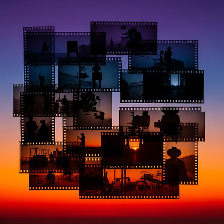Collage of film strips with silhouettes of people on the street.