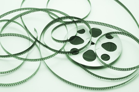 Unwound narrow retro film strip on a light reel with a movie clapperboard. Cinema movie accessories