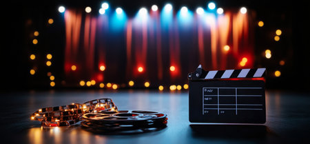 Clapperboard and film reels are placed on a stage set with vibrant lights. The atmosphere suggests an upcoming film or theater performance, enhancing the excitement.
