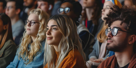 A diverse group of college students engaged in a lecture in a university classroom. Concept College Education, Classroom Environment, Diverse Group, Student Engagement, Academic Learning
