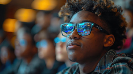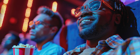 Group of focused moviegoers in red theater seats wearing 3D glasses, perfect for entertainment industry marketing and cinema advertising campaigns