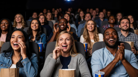 A diverse group of people is seen laughing and enjoying a film in a darkened movie theater. The composition showcases the audience, with varying skin tones and expressions of joy. The lighting suggests a screen presence. This image could be used for promoting cinema, entertainment, or conveying positive emotions.