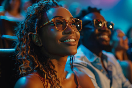 A diverse and happy audience of men and women are captivated while watching a film in a dark movie theater. Their smiling faces are illuminated by the bright light from the screen, conveying a sense of shared joy and entertainment.