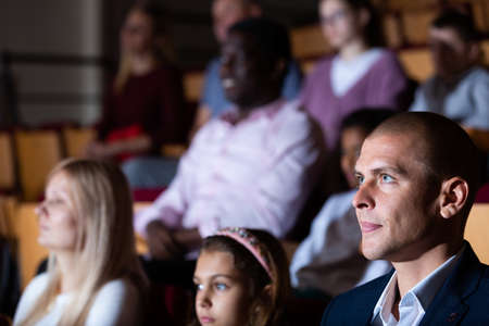 Man absorbed in watching stage performance in theater hall