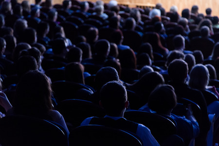 People in the auditorium looking at the stage. Shooting from the back