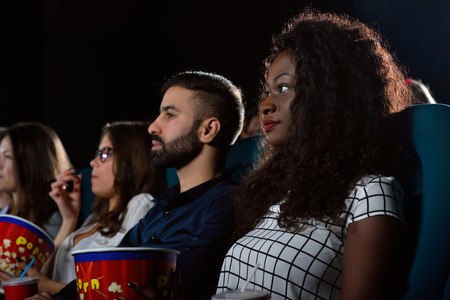 Modern young Black man and Caucasian woman wearing casual clothes sitting relaxed watching movie and eating popcorn at cinema