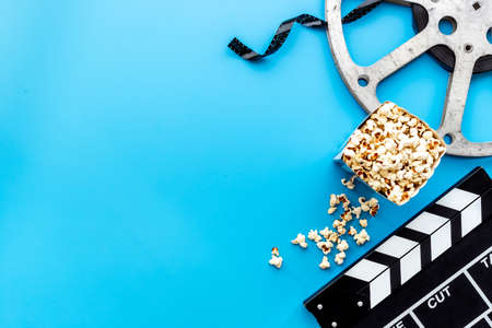Layout of film reel with popcorn and clapperboard. Cinema concept