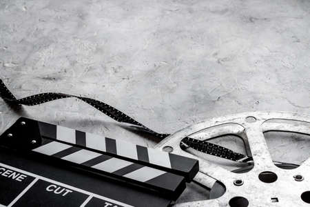Motion picture film reel with movie clapper. Cinema concept