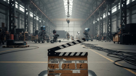 A striking cinematic ultrawide photograph capturing a classic director's clapperboard placed firmly