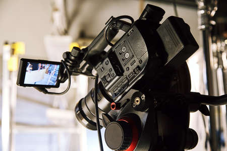 Behind video camera that recording online commercial or web film movie in the big studio production with professional equipment such as high resolution cam and monitors and LED light with crew team set