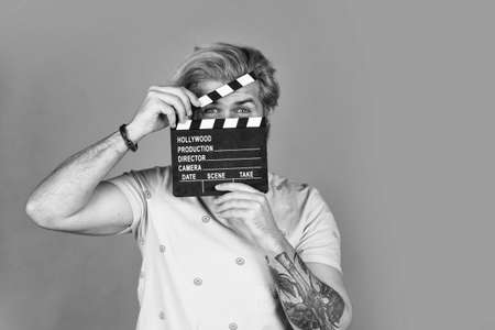 Actor casting. Shooting scene. Favorite series. Cinema production. Creative producer. Bearded man hold movie clapper. Film maker. Clapperboard copy space. Comedy or drama. Watch movie. Film director